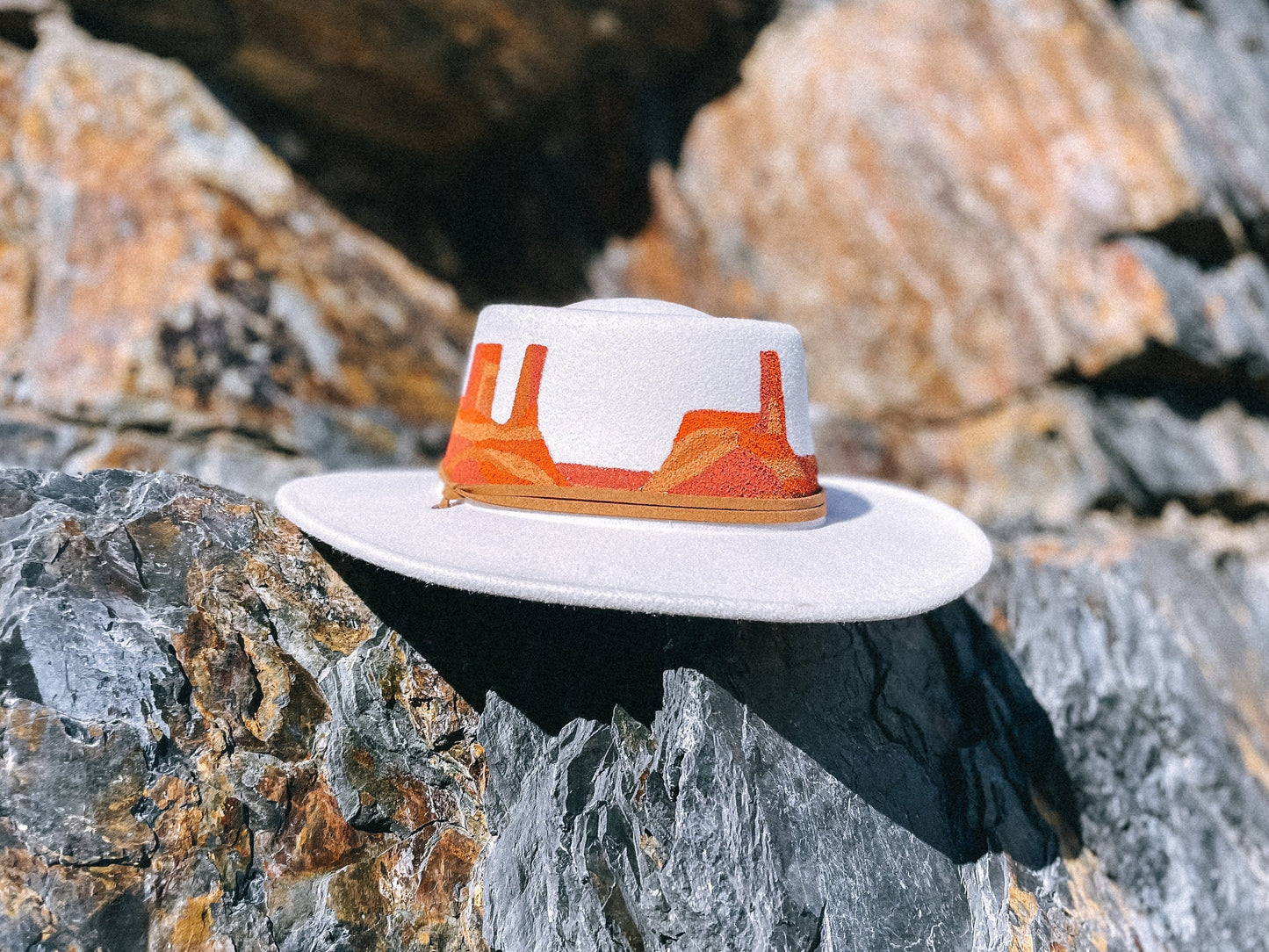 The Julianne Boater Hat is inspired by Southern Utahs red deserts. I referenced places such as Monument Valley to bring this beautiful hat to life. Each hat is hand painted to order, so there will be slight variations in each design. This just makes them more special!
